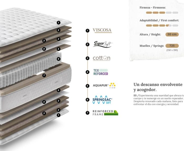 También encontraremos una plancha de Tex Reforced , esta capa se encarga de ofrecer estabilidad a los componentes. Seguidamente encontramos Aquapur Firm , un material que aporta un punto de firmeza al colchón de muelles Calma Soft. Su núcleo contiene Spring sac soft , carcasa de muelles ensacados suave , que proporciona la suavidad necesaria para el mejor descanso. Otros elementos a destacar son el Reinforced Frame o marco perimetral, que aporta un refuerzo en todo el contorno para evitar que los muelles se desplacen.