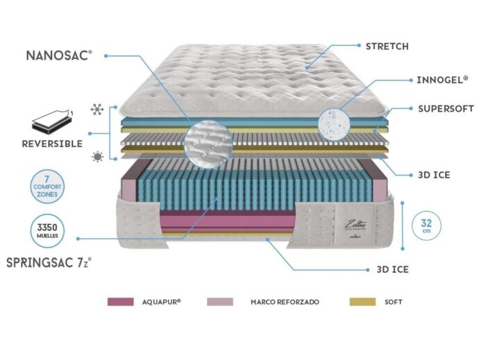 Mientras el topper te abraza, el núcleo del colchón de muelles Zeltia te ofrece un soporte con siete zonas de firmeza para mayor confort. Asímismo , el muelle Springsac 7z, alinea correctamente la columna consiguiendo un sueño saludable y sin interrupciones. Aparte se ajusta a la forma del cuerpo. También hace que los movimientos de la pareja sean inapreciables. por último el aire circula con facilidad y evita la sudoración corporal.